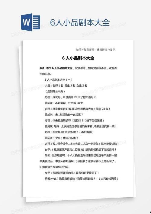 你知道吗?最近我在网上发现了一个超级搞笑的小品剧本,简直笑得我肚子都疼了!这个剧本叫做《六人欢乐秀》,简直就是一个小品界的宝藏啊!下面,我就来给你详细介绍一下这个剧本,保证让你笑到不行!